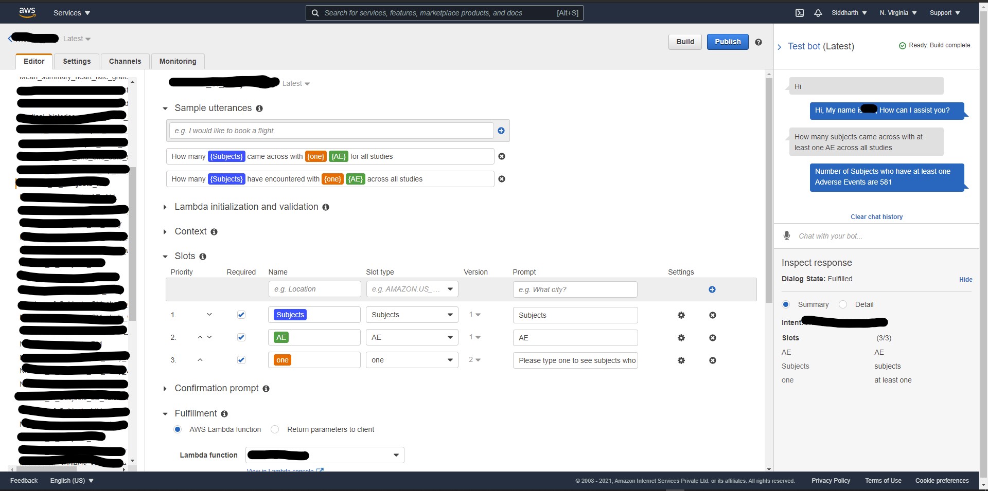 Author sample utterances on Amazon Lex with key information or keywords as slots, backend logic written in AWS Lambda which is connected to database API connector.